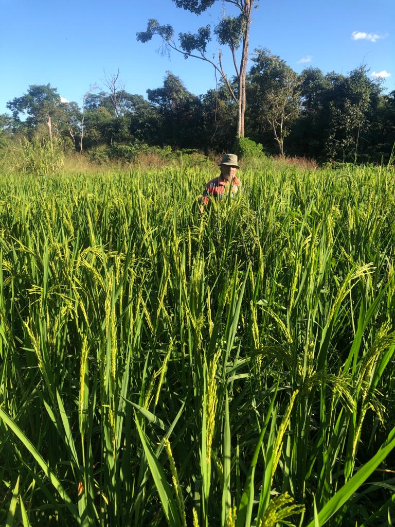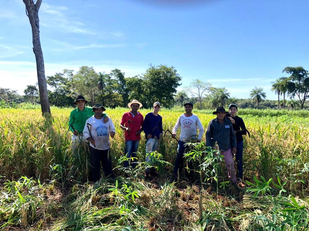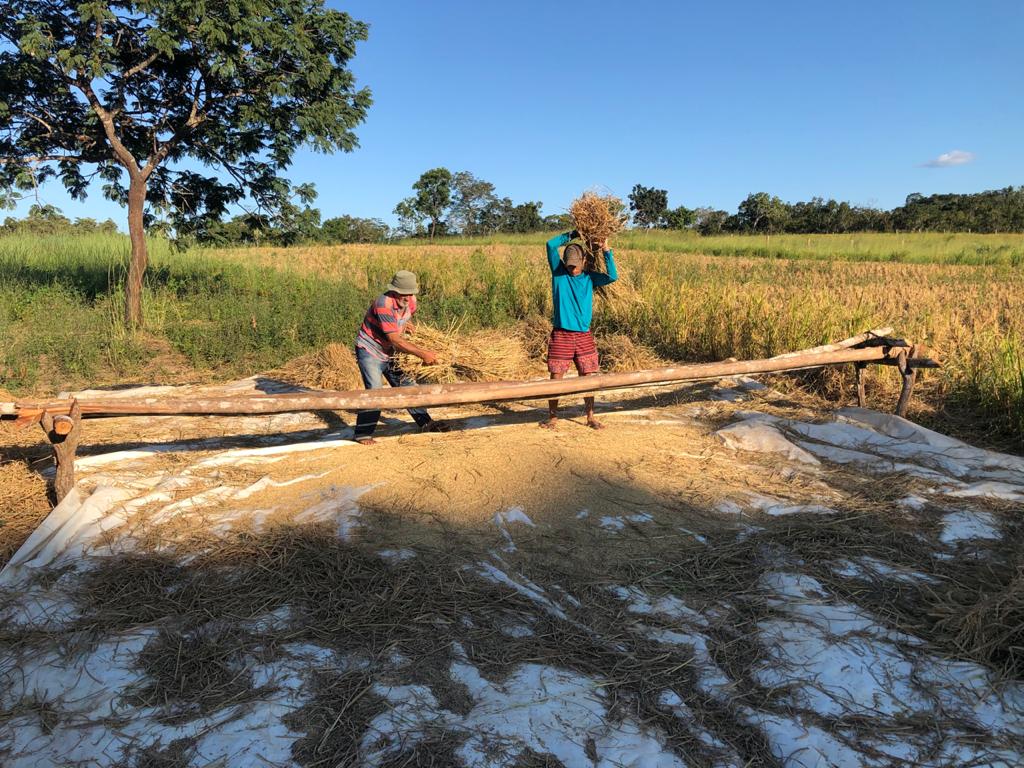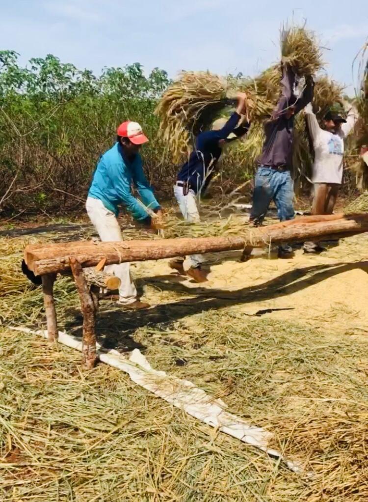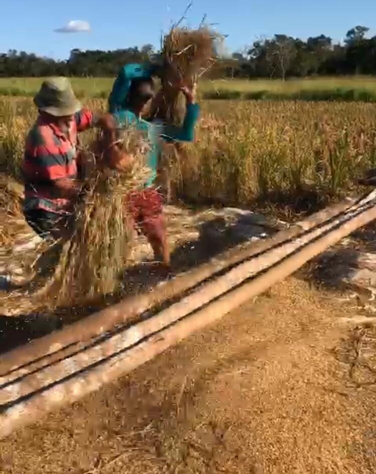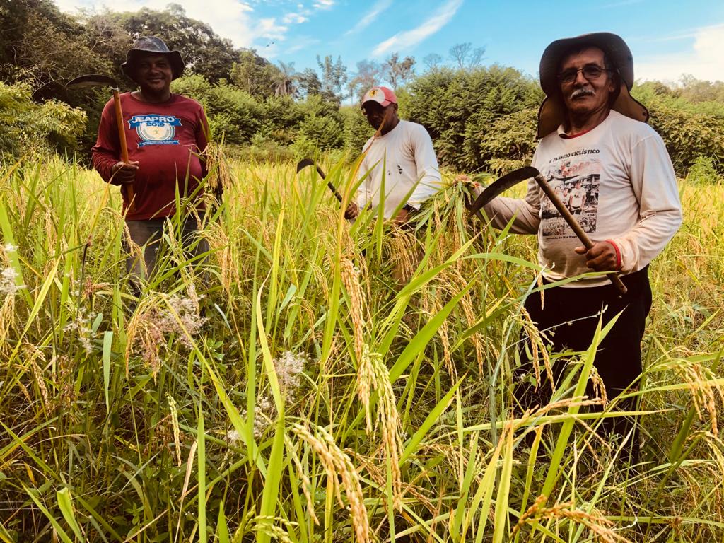 Seu Leocy Barbosa, morador da Região do Baixão, está comemorando a safra da produção de arroz, banana e mandioca na Chácara Sítio Novo. Este tipo de produção fortalece a agricultura familiar, com a tradição de trabalhar em mutirão, por meio da parceria de outros três produtores. A cada dia a colheita ocorre em uma roça, e todos contribuem.