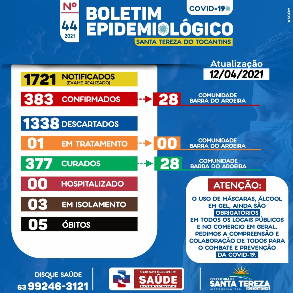 Aos poucos a maior onda de contaminação do coronavírus vem se dissipando gradualmente, após o esforço conjunto do Poder Público e população em manter o distanciamento social. Em Santa Tereza do Tocantins a população passou por dias de tensão e medo, mas começa a se aliviar, não com as regras de prevenção, mas com o número de casos que vem se reduzindo.