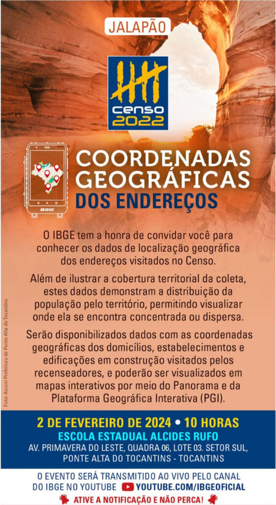 No dia 2 de fevereiro, às 10 horas, na Escola Estadual Alcides Rufo, em Ponte Alta do Tocantinso IBGE divulga as coordenadas dos endereços. No Censo Demográfico 2022 foi a primeira vez que o Instituto captou as coordenadas dos domicílios urbanos. Obter a informação georrefenciada no nível mais detalhado possibilita a realização de agregações de dados nos mais diversos recortes geográficos, beneficiando a produção de estatísticas.
