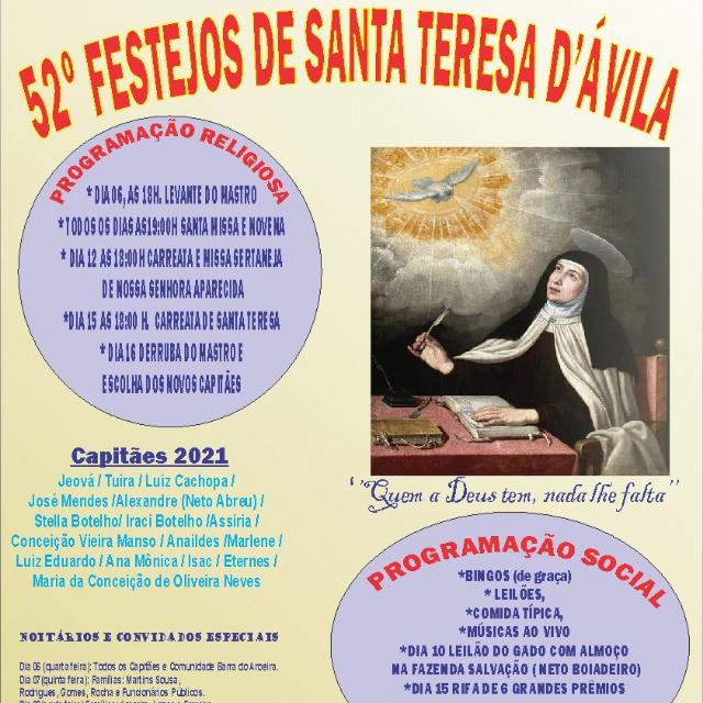 Este ano, os moradores e visitantes que participam do Festejo de Santa Tereza do Tocantins, podem comemorar o retorno da festividade, que será realizada dentro dos protocolos sanitários. O 52º Festejo de Santa Tereza D’ávila acontecerá entre os dias 6 e 15 de outubro e contará com uma programação diversificada.