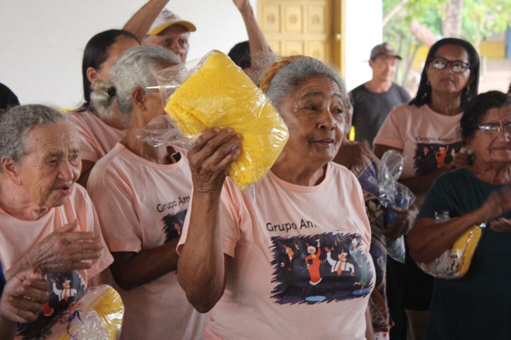 Ao final do encontro cada idoso foi presentado com uma lembrança ofertada pela primeira-dama Elenisa: uma toalha personalizada, reforçando o carinho da equipe pelo grupo.