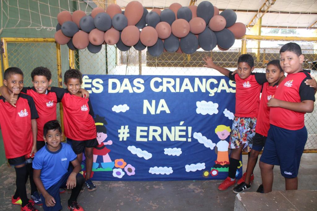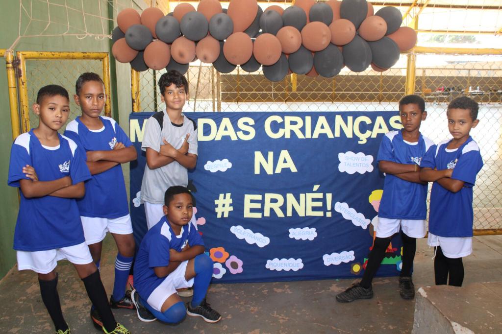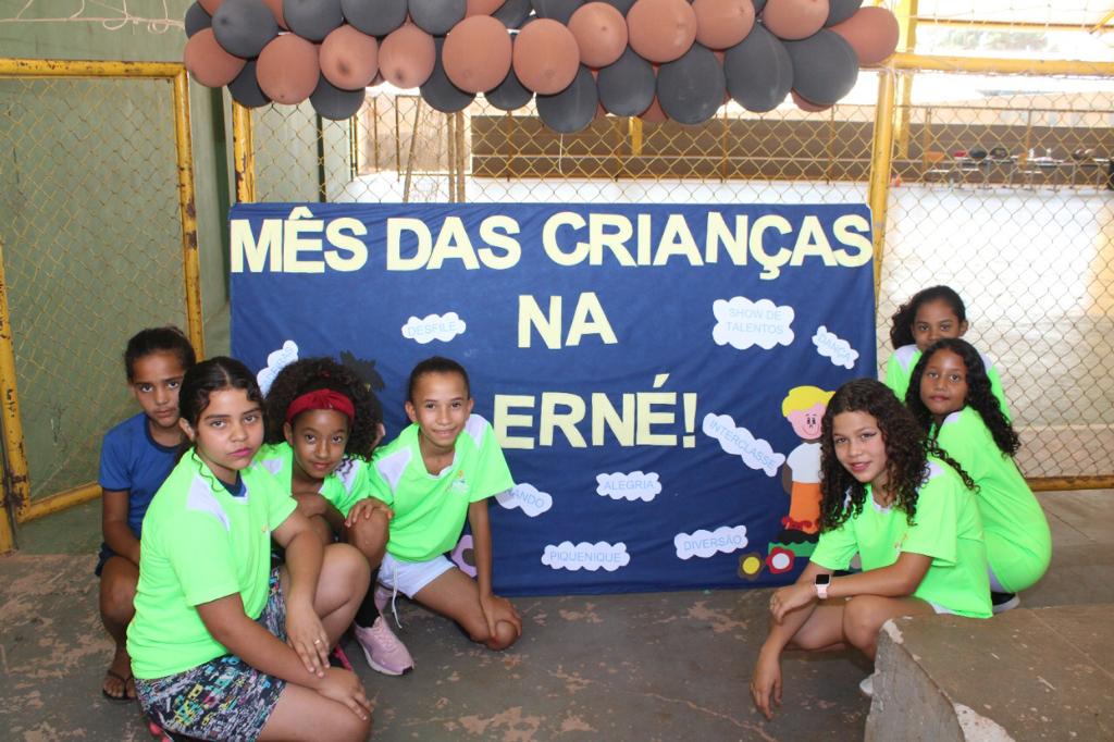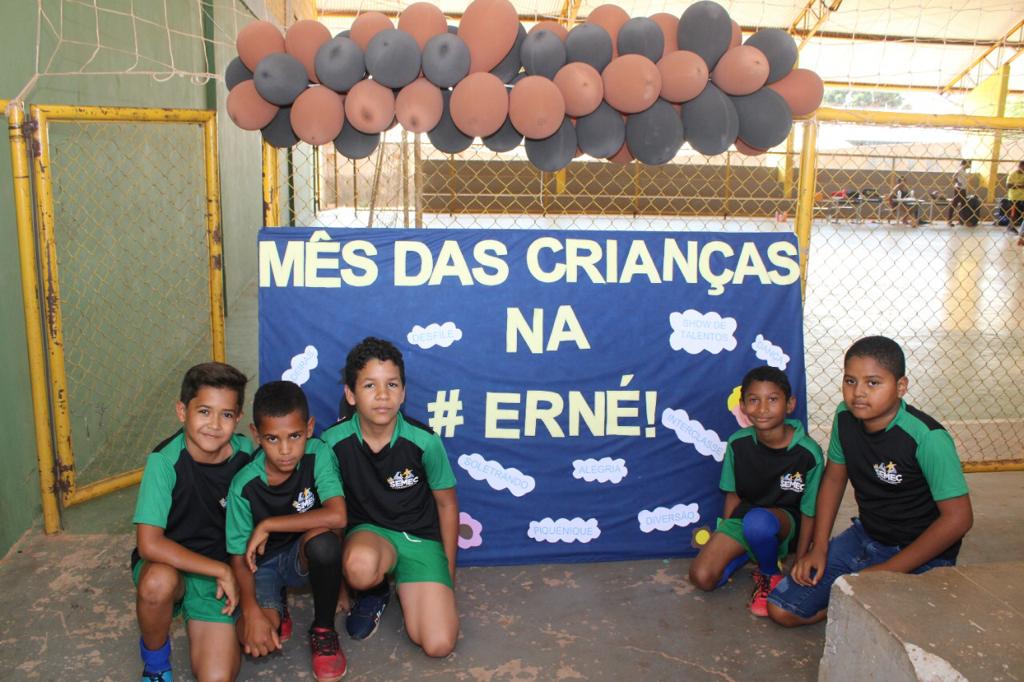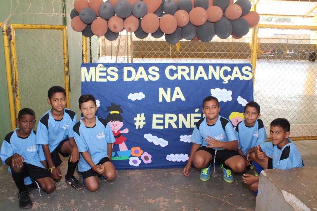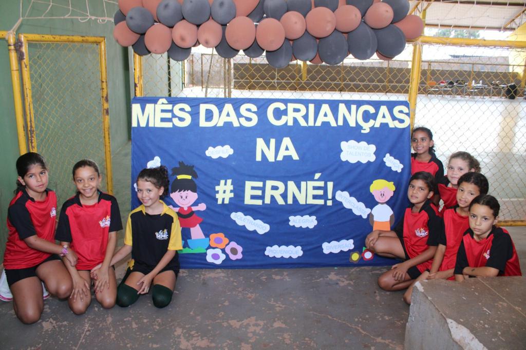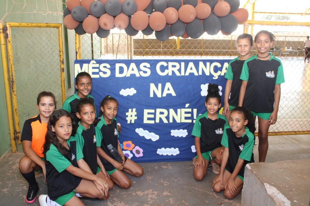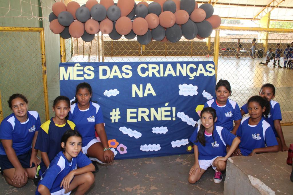 A Escola Municipal Professora Ernestina Vieira Soares realizou uma competição interclasse e momento cívico em comemoração ao Dia das Crianças. A programação referente ao tema prossegue durante todo o mês, promovendo integração e diversão entre os alunos