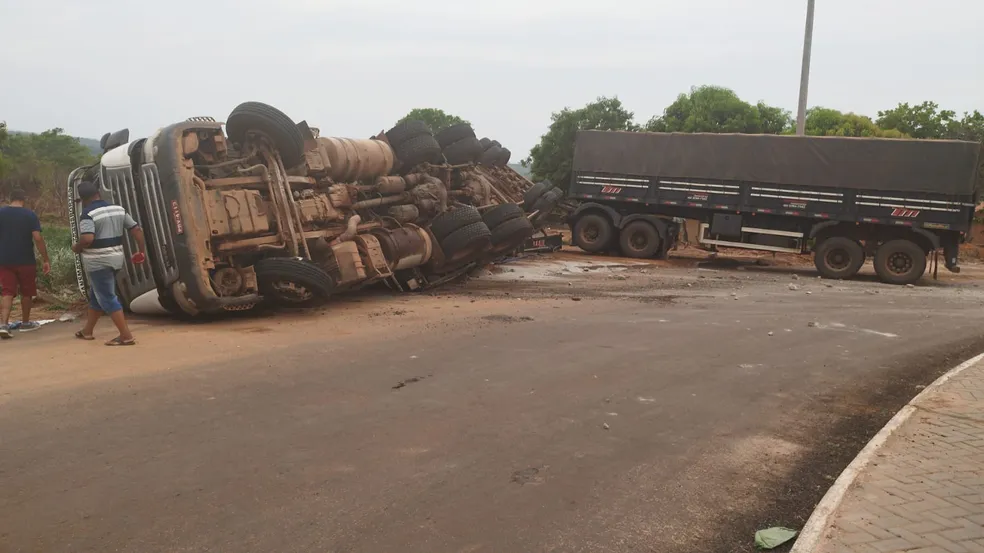 Motorista de caminhão bitrem perde o controle e tomba na rotatória de entrada de Novo Acordo