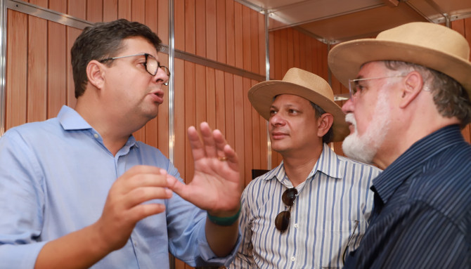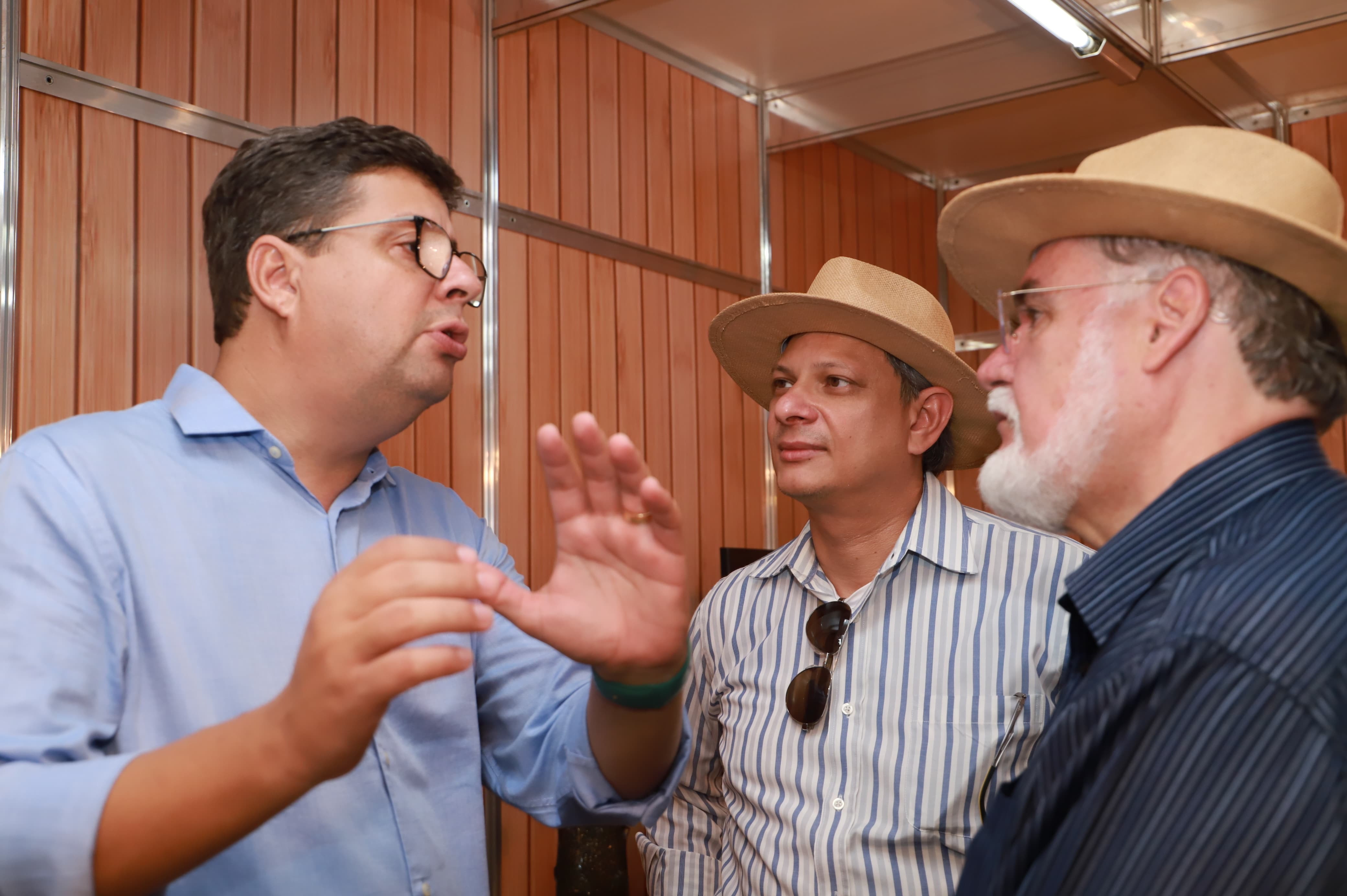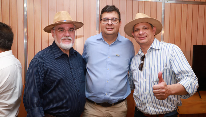 Vice-presidente do Naturatins, José Aníbal Lamattina, recebe no estande do Instituto, o CEO do Grupo Fazendão, Volney Aquino Santos, (ao centro), e o presidente da Agência Fomento Tocantins, Portilho Prado (à esquerda) – Walker Ribeiro/Governo do Tocantins file_download