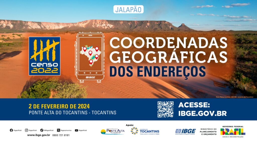 O Instituto Brasileiro de Geografia e Estatística (IBGE) vai divulgar no dia 2 de fevereiro, às 10 horas, os dados das coordenadas dos endereços do Censo Demográfico 2022. O município escolhido para sediar o evento é Ponte Alta do Tocantins, portal de entrada do Parque do Jalapão. O presidente do IBGE, Marcio Pochmann; o governador do Tocantins, Wanderlei Barbosa, e demais autoridades estarão presentes.
