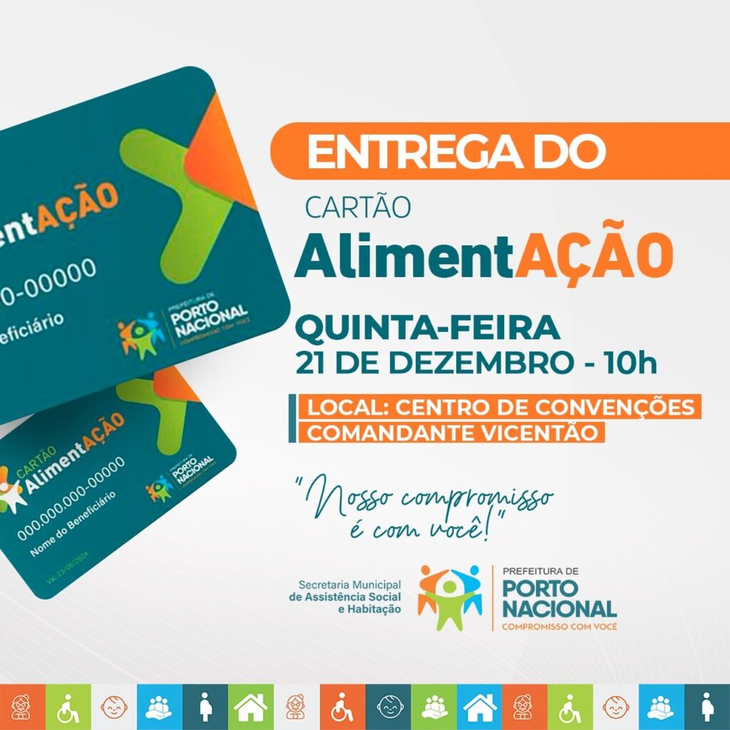 A Prefeitura de Porto Nacional começa, nesta quinta-feira, 21 de dezembro, a entrega do Cartão AlientaÇão para as (os) 1 mil beneficiárias (os). A entrega vai se dar em dois momentos: às 10 horas, no Vicentão, na sede central da cidade e às 16 horas na Escola Jacinto Bispo, em Luzimangues.