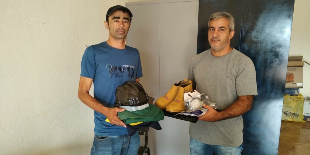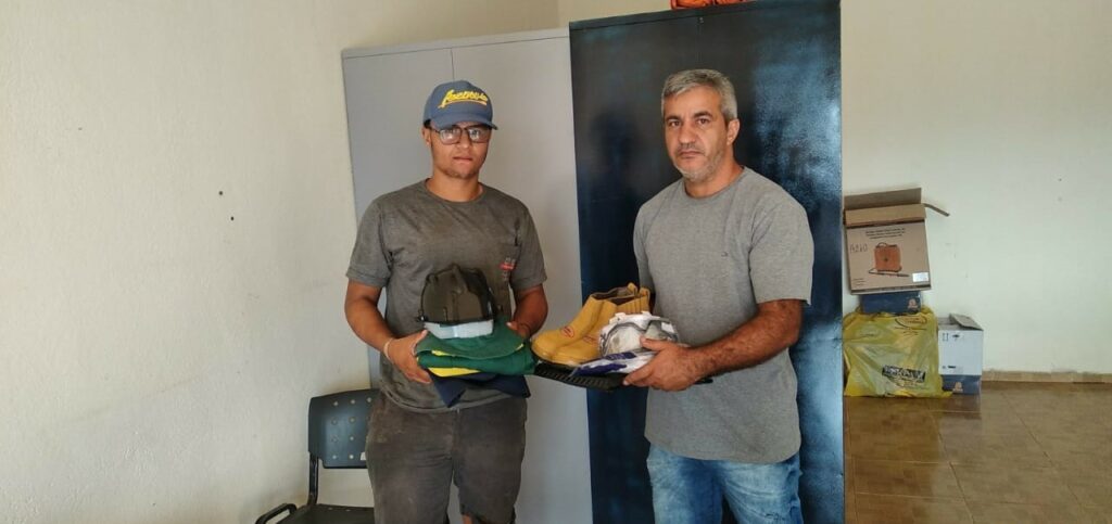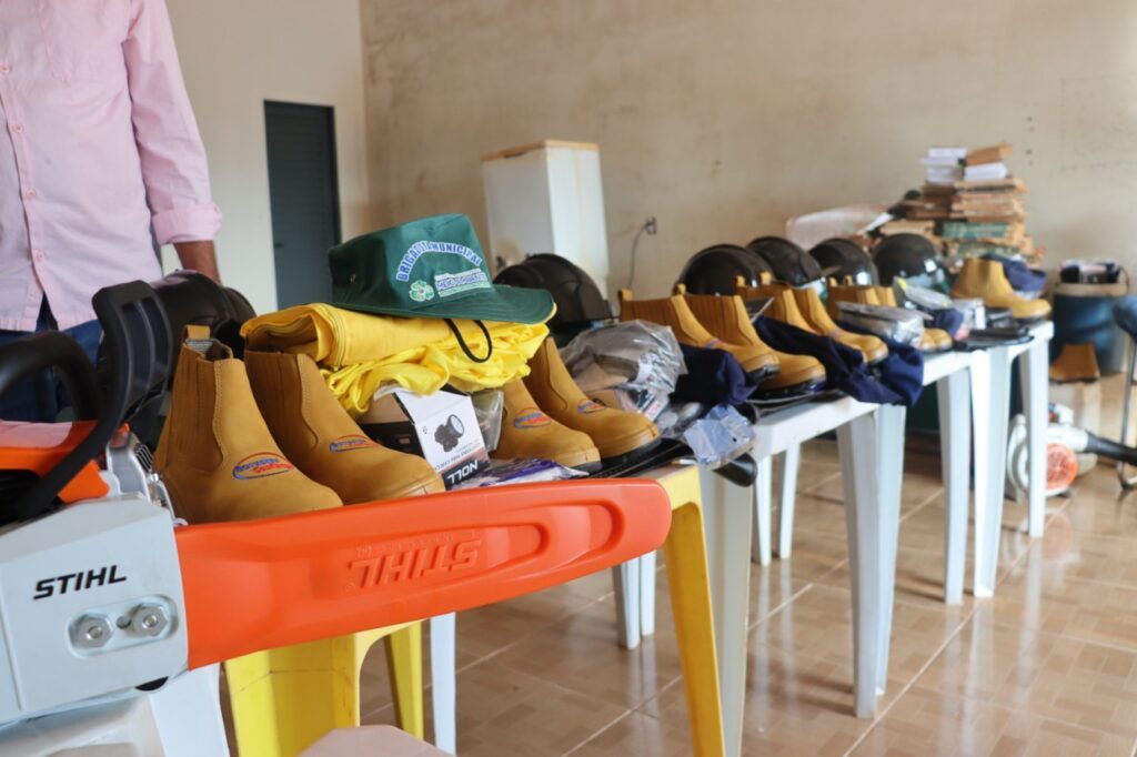 Os kits entregues são compostos por calças, camisetas e camisas manga longa, chapéus com proteção, capacetes, coletes, óculos, balaclavas, lanternas, capacetes, perneiras, pulverizador costal e motosserra.