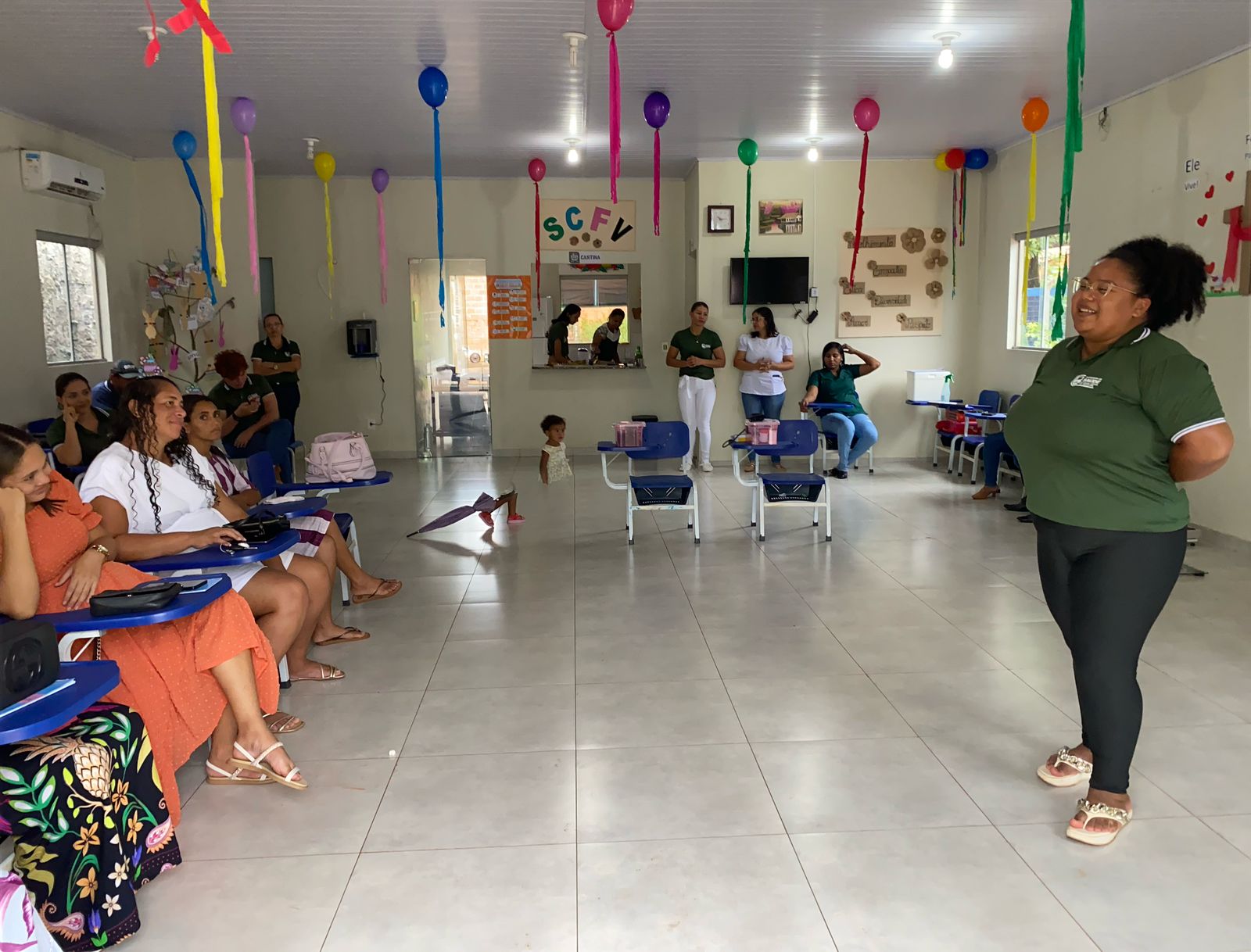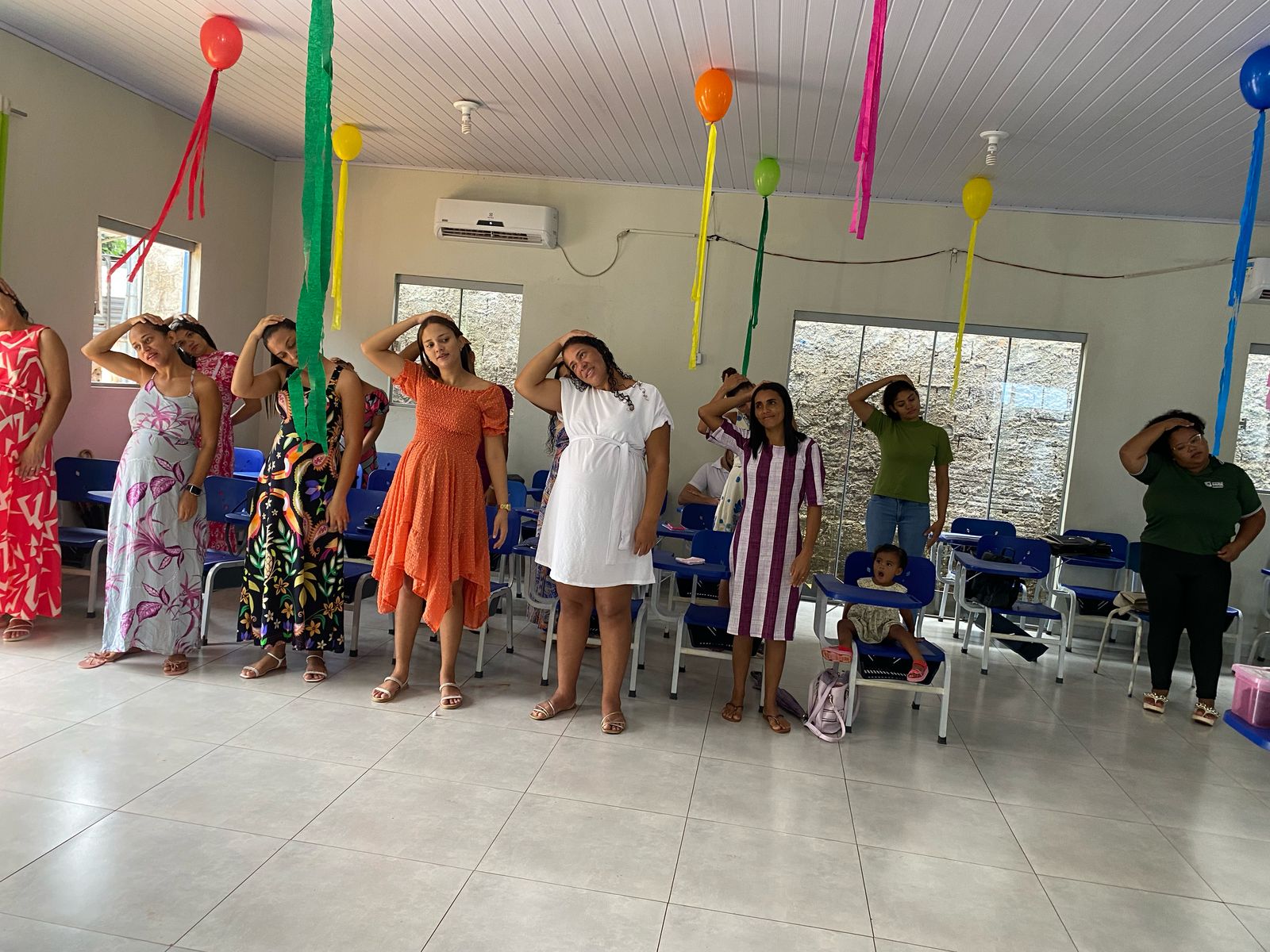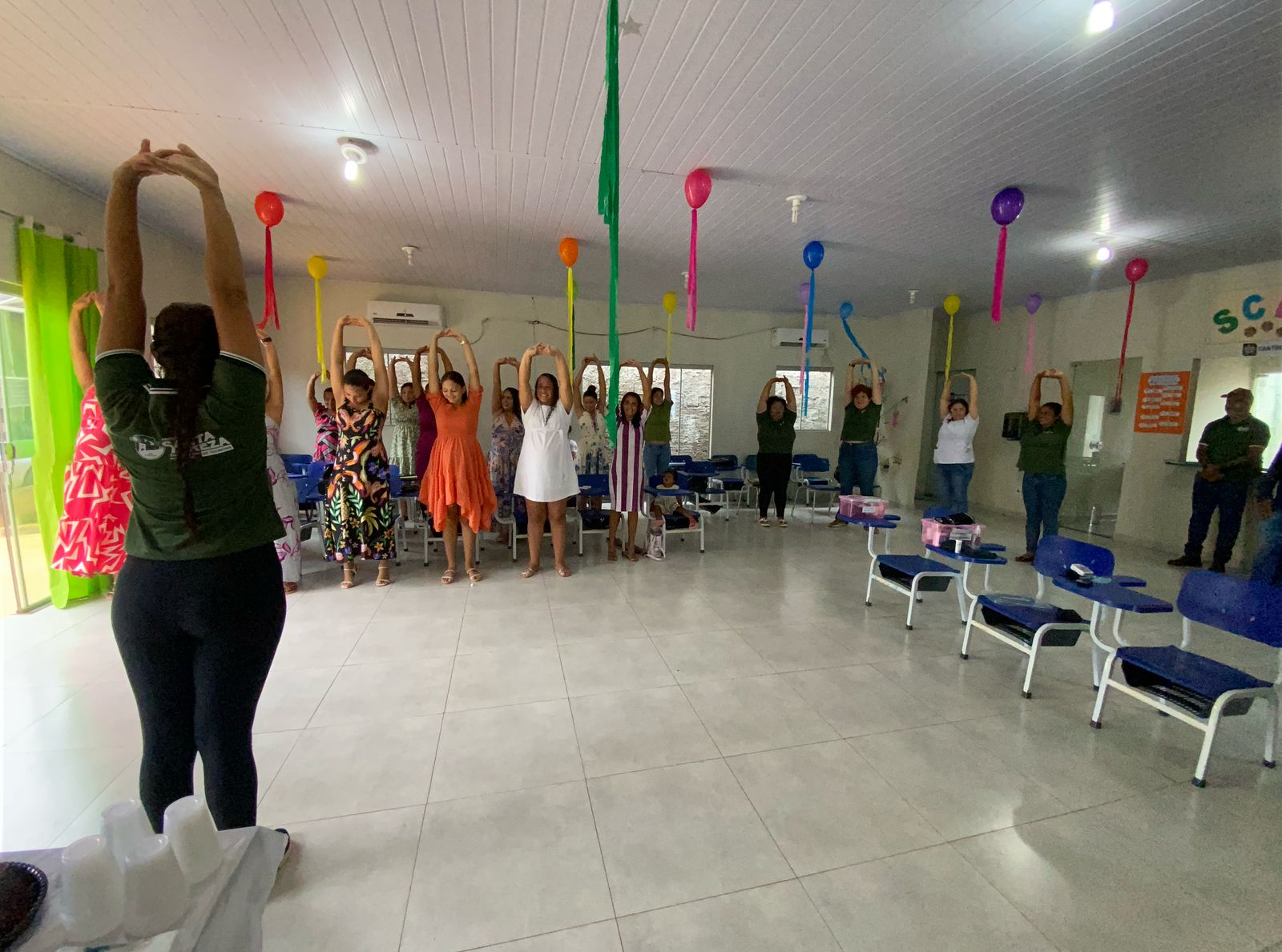 Durante o encontro, as gestantes receberam aferição de sinais vitais e medida antropométrica, sendo acompanhadas de perto pelos profissionais da saúde. A programação seguiu com a fala da educadora física Beatriz Vieira, que abordou a importância da prática de atividades físicas na gestação. Em seguida, conduziu uma dinâmica de ginástica laboral com a participação de todas.