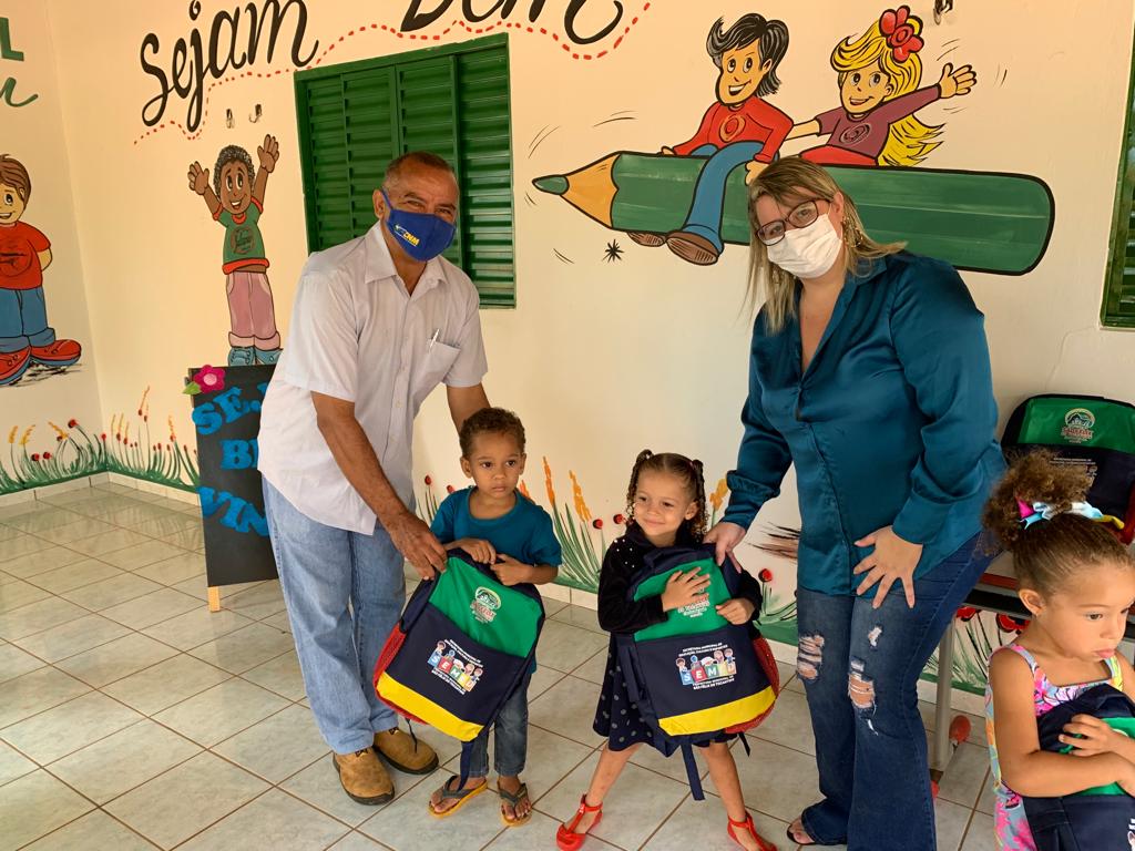 O prefeito Carlão, ao lado de vereadores e da secretária municipal de Educação, Denise Cella, iniciou a realização das entregas de mochilas, cadernos, e outros materiais de estudos para todos os alunos matriculados