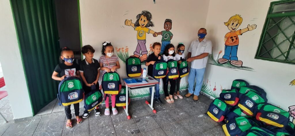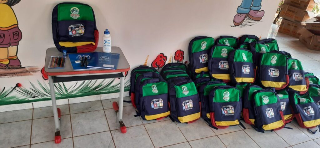 Os kits entregues contêm: caderno brochura, caderno de desenho, apontador, dois lápis, uma caixa de lápis de cor 12 cores, além de uma mochila e uma garrafinha para água.
