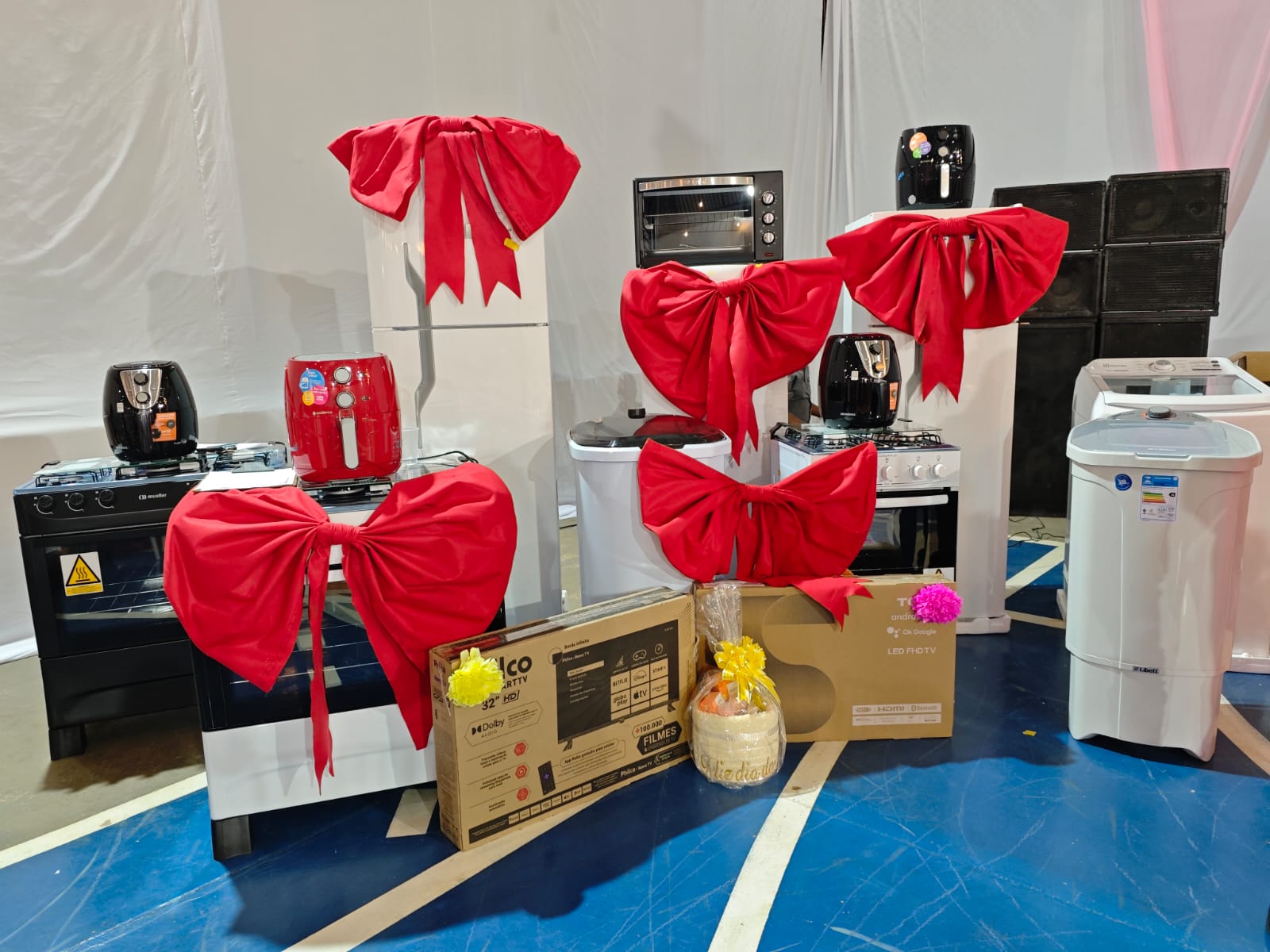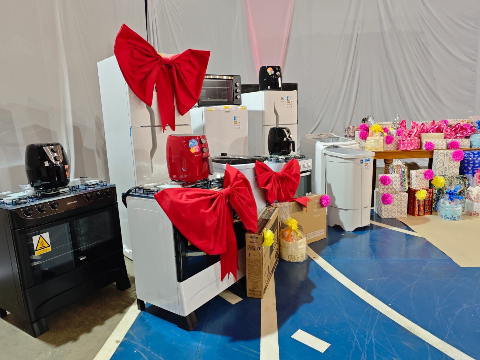Um dos momentos mais aguardados foi o sorteio de brindes. Centenas de prêmios foram distribuídos, desde lembranças simbólicas até itens de grande valor. Destaque para três geladeiras, fogões e televisores, que fizeram a alegria das mães sorteadas. A cada número anunciado, a quadra vibrava em um clima contagiante de expectativa e emoção.
