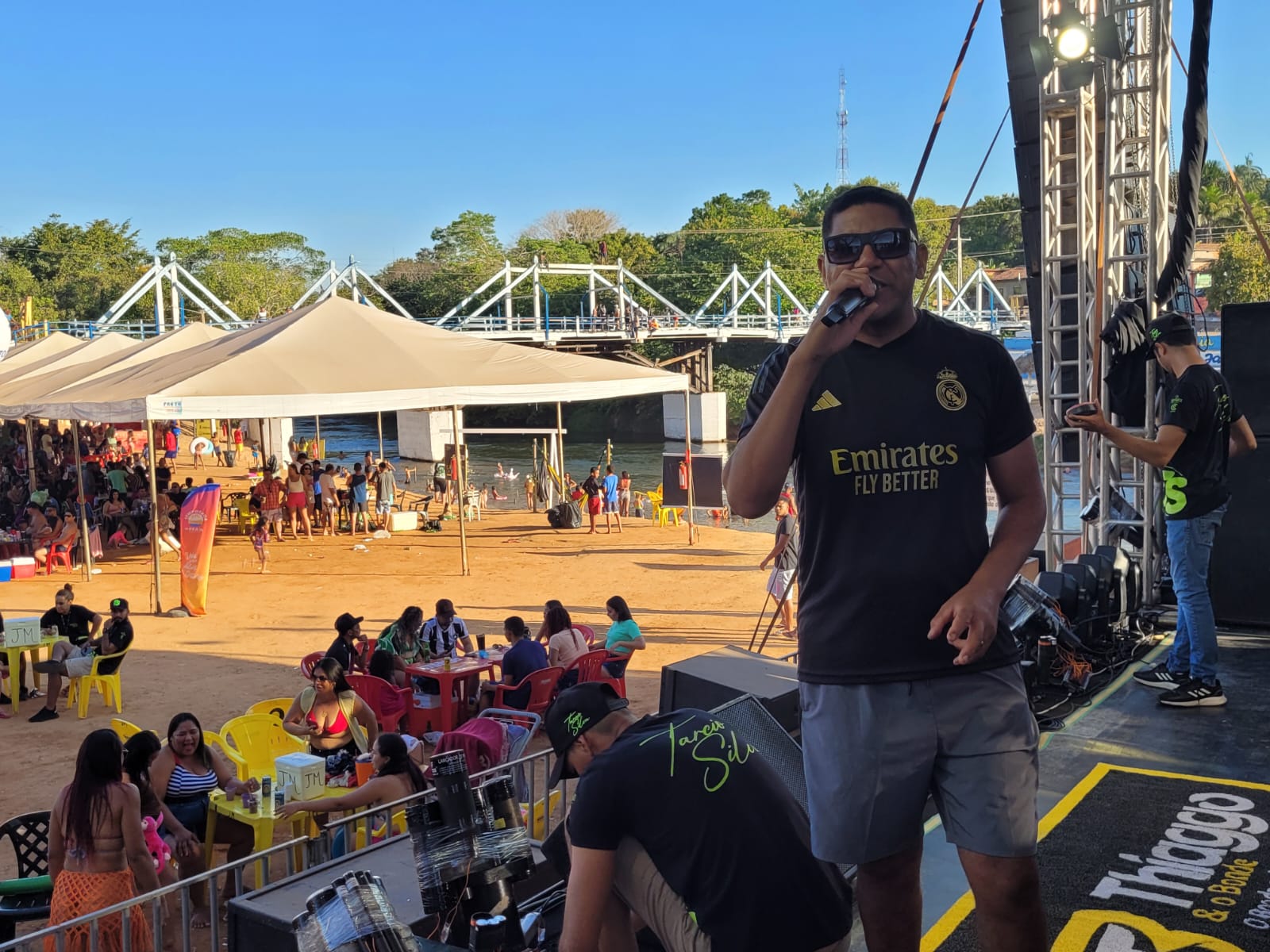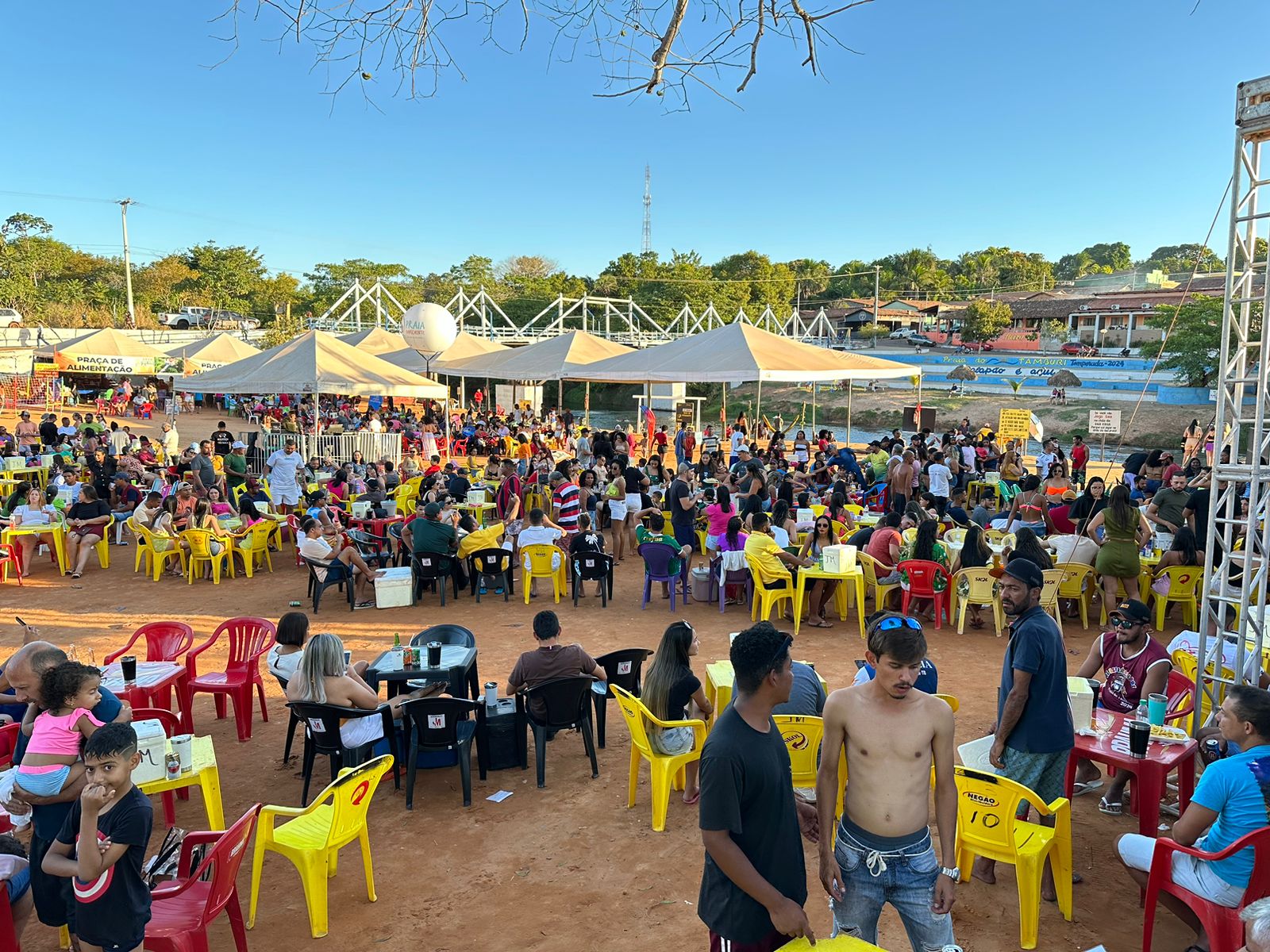 Ao fundo, a famosa ponte de madeira, e à frente, o pé de tamburi, árvore que deu nome à praia. Assim quem prestigia o ambiente tem sempre uma linda paisagem, e o sucesso do verão foi comemorado pelo prefeito Kleber do Sacolão, que esteve no evento.